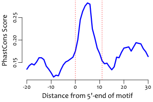 | Average position of motif in targets: | 197.8 +/- 74.5bp |